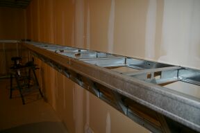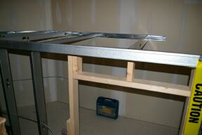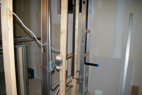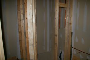 | Plumbing in Pain Room wall. | Framing for model railroad. | ||