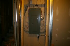 | Furnace room wall at bottom of stairs. | Closet around service panel. | Shower stall in bathroom. | |