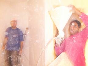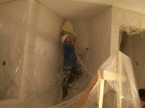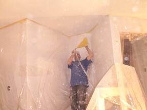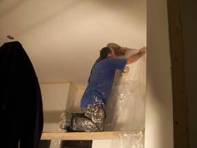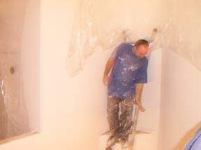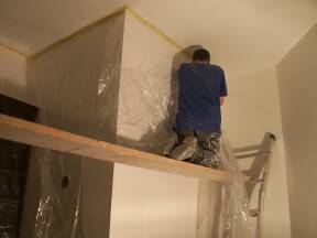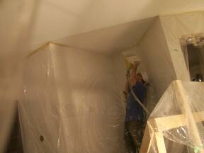 Spraying ceiling at top of stairs. |