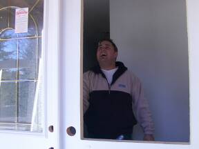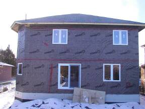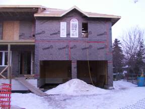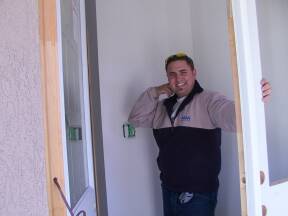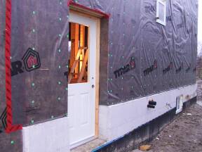 | Testing door operation. | Attaching house wrap above balcony door. | Checking out the job. | ||