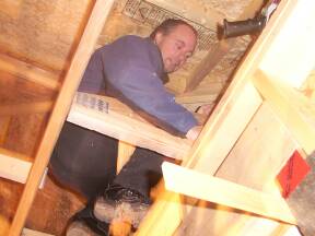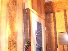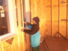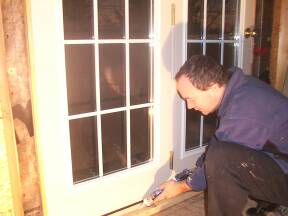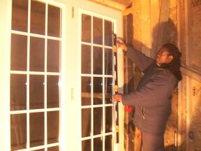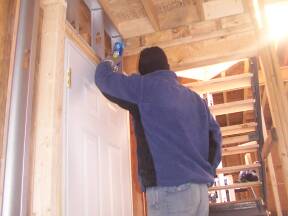 | Sliding door in kitchen installed. | Foaming around door to garage. | ||