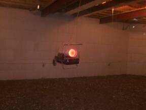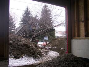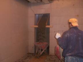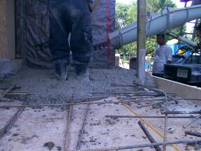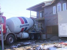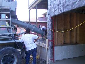 | Heater hung from ceiling. | Chute for concrete in place. | Concrete arrives. | |||