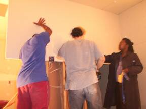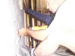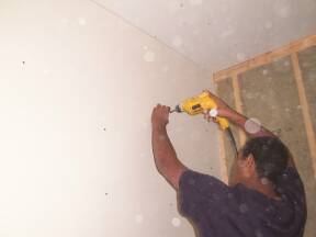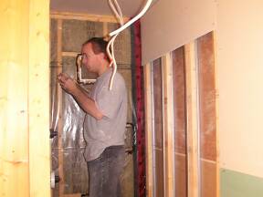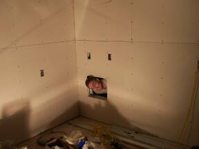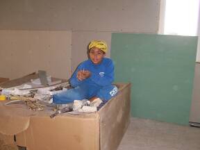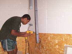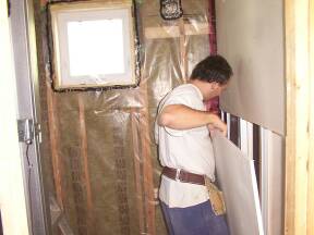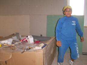 | Removing styrofoam from bottom of wall. | Looking into alarm system. | ||