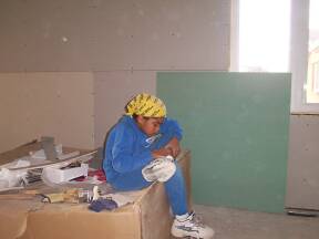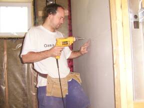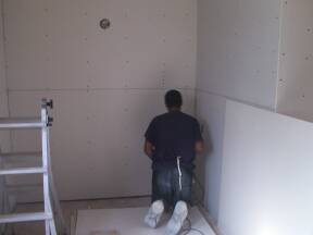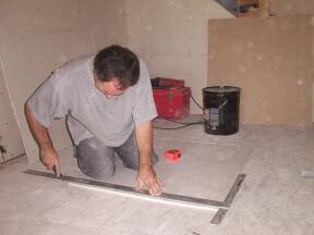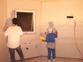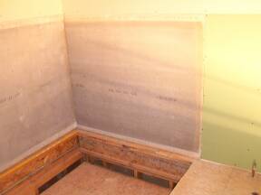 | Concrete board around bathtub of main bathroom being installed. | |||