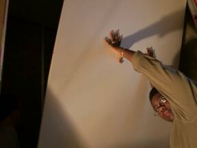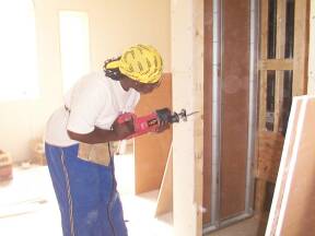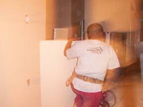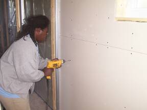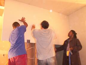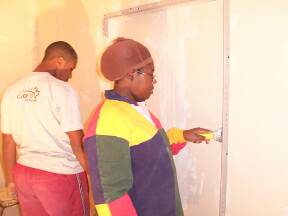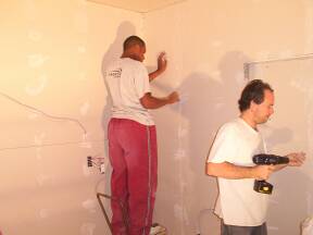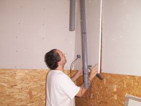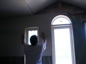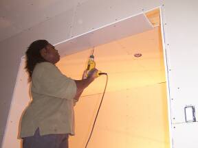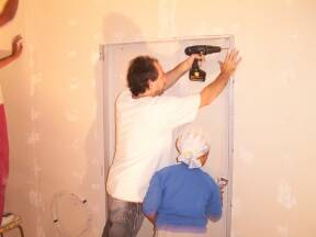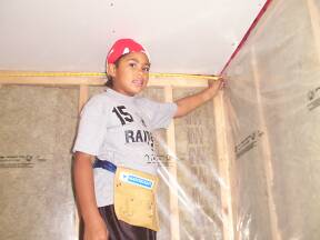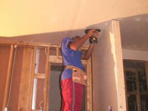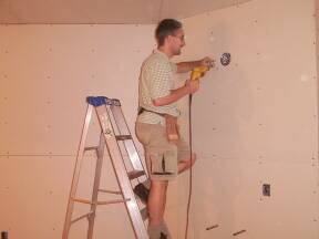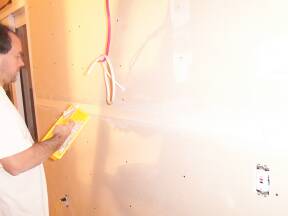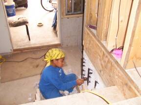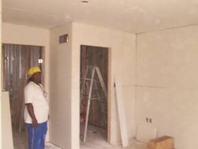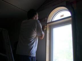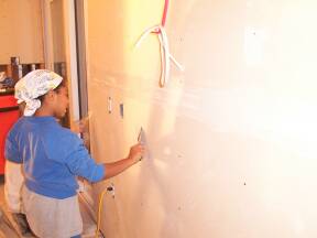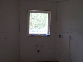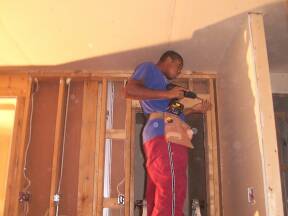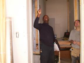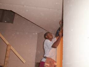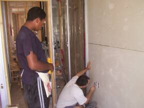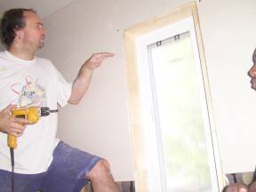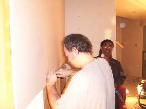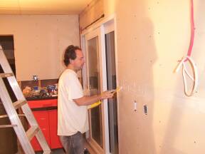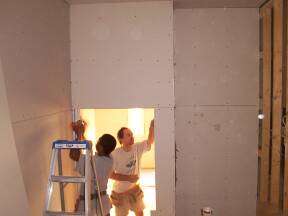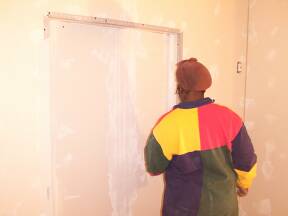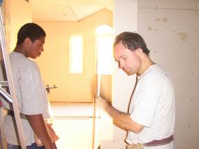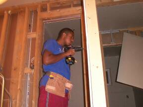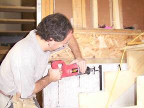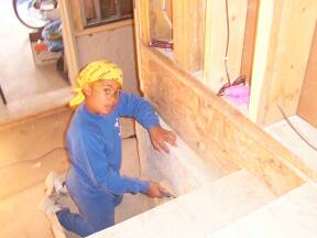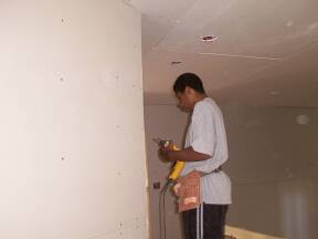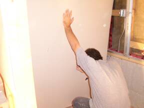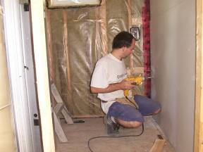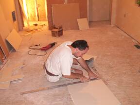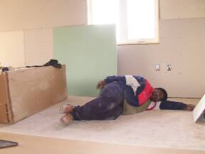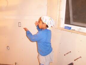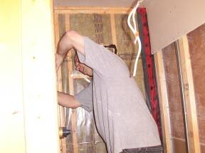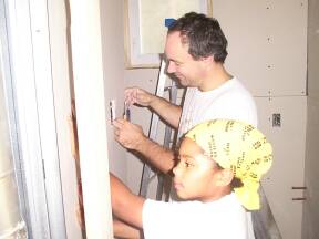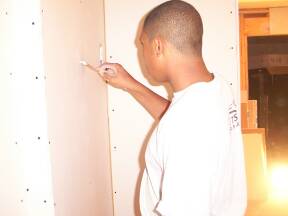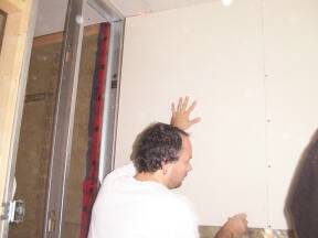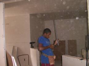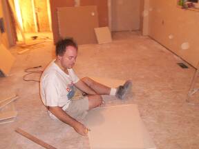 | Measuring west wall. | Cutting piece at closet door. | ||