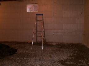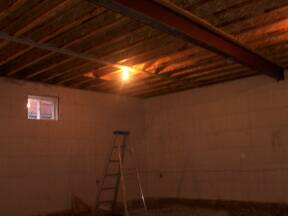 December 13, 2002: Roof framing continues above while some work continues in the basement.