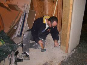 Removing concrete to provide space for door hardware.