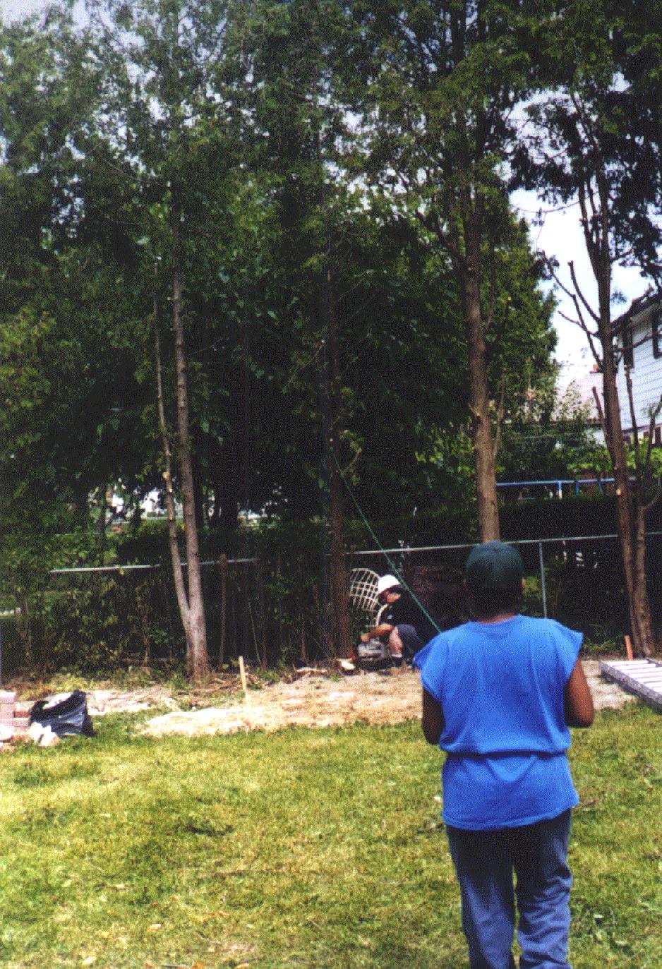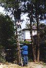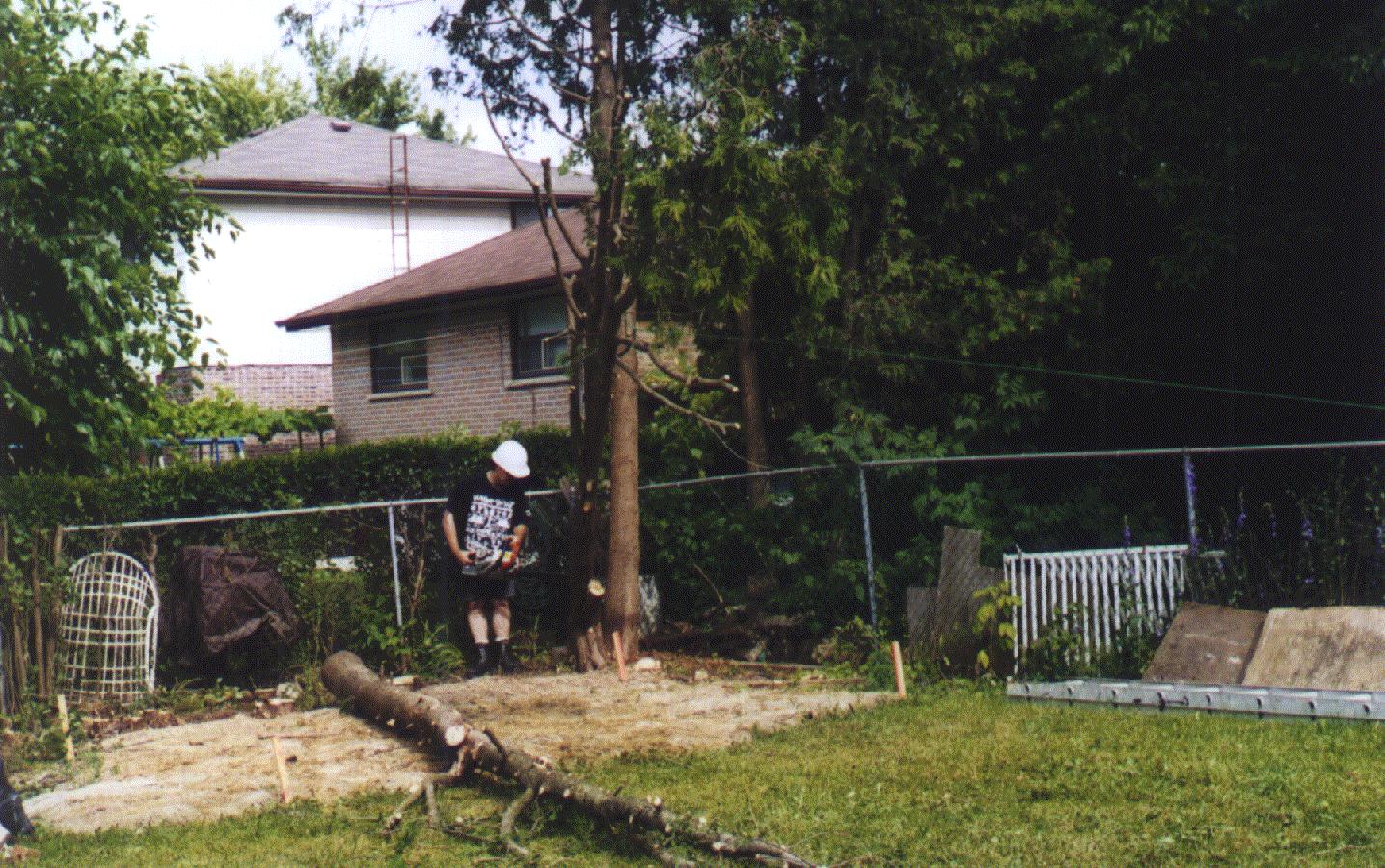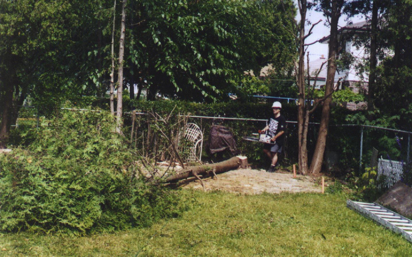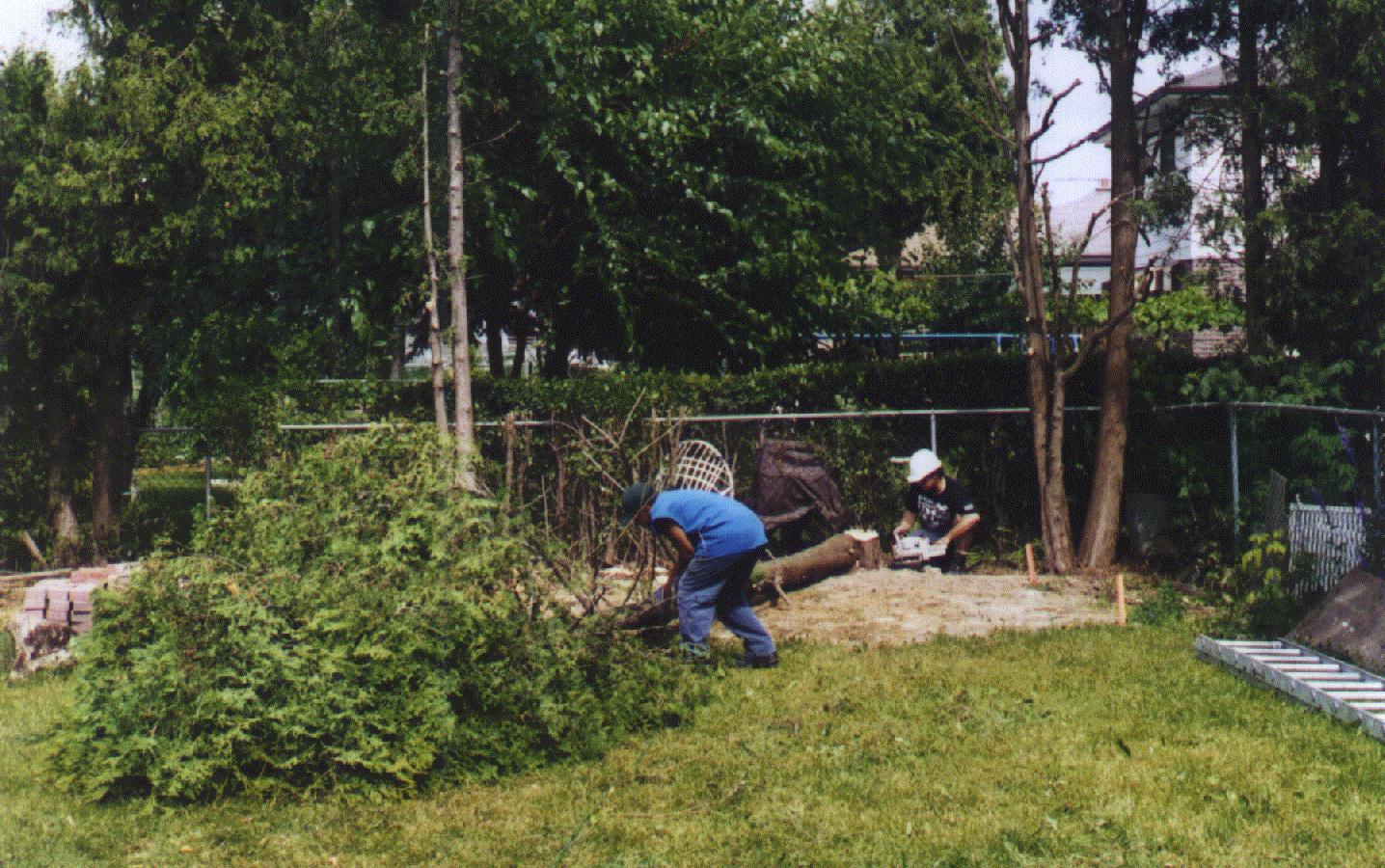 ![]() Preparing to cut down cedar trees where shed is to be located. |